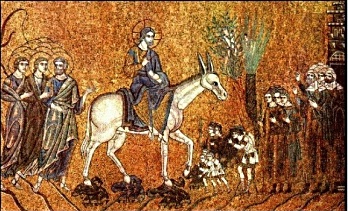 Вход Господень в Иерусалим. В дни перед главным еврейским праздником Пасхой Иисус Христос приблизился к Иерусалиму. Подойдя к горе Елеонской, Люди устилали Ему путь одеждой и ветвями деревьев и восклицали - "Осанна Сыну Давидову! благославен Грядущий во имя Господне! Осанна в вышних!" Христос вьехал в Иерусалим на осле, что символизировало Его кротость и миролюбие.
