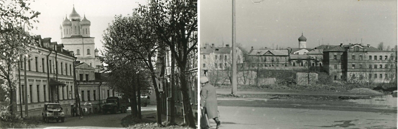 Фото 60-х. Улица Герцена. На первом фото: слева - бывший доходный флигель Сафьянщикова, справа - бывший дом купца Селезнева. На втором фото: на переднем плане дом Седельщикова, прямо - бывший дом купца Селезнева, правее бывший дом Хмелинского. За ними виден купол церкви Козьмы и Дамиана с Примостья. Храм Богоявления представляет собой ценнейший памятник древнего зодчества, а стоящая при нем замечательная звонница по праву считается лучшим и типичнейшим образцом подобных сооружений в древнем Пскове.