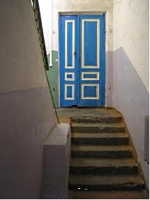 Фрагмент интерьера парадной лестничной клетки. Площадка в уровне пристройки парадного входа Окна, расположенные на крайней правой оси фасада, повторяют габариты и рисунок расстекловки окон боковых граней соседнего ризалита. Плоскость стены между ризалитами по 3 осям прорезана оконными проемами различных габаритов.