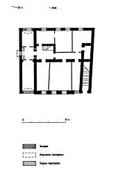 План подвала задает продольная капитальная стена, делящая его объем на две примерно равных части. Вход в подвал был устроен со стороны дворового фасада.