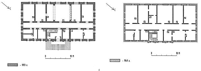 г. Псков, ул. Л. Толстого, 95. Усадьба "Березка" баронов Медем. Главный дом. 2 пол. XVIII в., 1893 г., 1949 г. План 1-го этажа. План 2-го этажа.