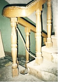 г. Псков, ул. Л. Поземского, 6. Дом общества слепых. 1953 г. Фрагмент интерьера. Перила лестницы. Представляют интерес деревянные перила лестниц с точеными балясинами и поручнями . Фундаменты бутовые ленточные; стены кирпичные, оштукатуренные, окрашенные; перекрытия по деревянным балкам; крыши по деревянным стропилам, крыты шифером; лестничные марши с железобетонными ступенями по металлическим косоурам. Габариты в плане: 68.6 х 15,2 м.