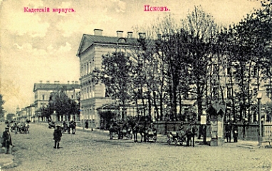 На фото: карта губернского Пскова с обозначением кадетского корпуса За 36 лет Псковский Кадетский корпус дал России таких замечательных выпускников, как генерал А.М. Крымов, военные историки Н.Е. Духанин и П.Н. Симанский, военный теоретик А.К. Келчевский, художник П. Митурич и другие.Изменение назначения здания из Присутственных мест в учебное заведение, потребовало его расширения и приспособления. В 1836-1843 гг. строится домовая церковь с наружной звонницей со стороны Губернаторской улицы, в 1858 г. перестраивается заново в связи с надстройкой 3-го этажа. Над западным фасадом здания установлена вышка оптического телеграфа. В 1854 г. к главному зданию были пристроены двухэтажные крылья со стороны Ивановской улицы, а через три года такие же крылья построены со стороны Губернаторской. В 1857-59 гг. над всем зданием был надстроен третий этаж. После победы Великой Октябрьской социалистической революции в здании размещались советские военные учреждения. Здесь же находился Штаб Северного фронта, комиссаром которого являлся Б.П. Позерн, один из активных участников установления Советской власти на Псковщине, впоследствии делегат ряда партийных съездов.