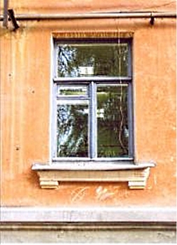 г. Псков, Октябрьский пр-т, 29 Дом жилой. 1957 г. Фрагмент дворового фасада. Окно 1-го этажа. Кордон цоколя. Фото октябрь 2007 г. Ризалиты увенчаны прямоугольными аттиками, края которых имитируют широкие "столбики"; края и середина аттиков обработаны филенками.