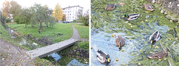 Фото: октябрь 2015 год Через ров проложен пешеходный мост, возле которого ютятся утки, которых с удовольствием подкармливают жители соседних домов.