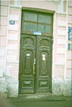 Промежутки между ризалитами заняты одним оконным проемом, оформленным стилизованным рустом; верх стены под карнизом украшен профилированными тягами и крепованным накладками; под окнами - филенками. На крыше по ширине центрального ризалита расположен сложный аттик с чердачным окном, оформленным на манер флорентийского окна со стилизованными полуколонками. Над архивольтом обозначена дата строительства дома - 1889; аттик украшен фигурными пилястрами с фасками и скоциями, увенчан сложнопрофилированным раскрепованным карнизом боковые части аттика решены в виде столбиков с шатровыми крышками, украшенных филенками. Дверь парадного входа. Фото Руденко О.В. 2002 г. Такие же столбики установлены над лопатками крайних "ризалитов". Между столбиками были ажурные кованые решетки (утрачены). Боковые и дворовый фасады решены без декора, исключение - венчающий карниз по периметру здания и пристроек, Подвал в плане прямоугольный с продольной несущей стеной и небольшой пристройкой со стороны двора.![]() Два входа в подвал устроены с юга со двора. Высота помещений подвала 2,3 м. В западном помещении поставлен в три ряда деревянных стоек и по ним деревянных балок для укрепления перекрытия, в восточном помещении - один ряд балок на стойках, стена главного фасада укреплена кирпичными столбами и двутавровой металлической балкой. Перекрытие подвала пристройки усилено в помещении подвала деревянными балками шириной 30 см (оштукатурены). Планировка этажа повторяет план подвала в несущих стенах. Часть помещений выделена тонкими кирпичными перегородками, опирающимися на перекрытие. Система взаимосвязи помещений нарушена неоднократными перепланировками.